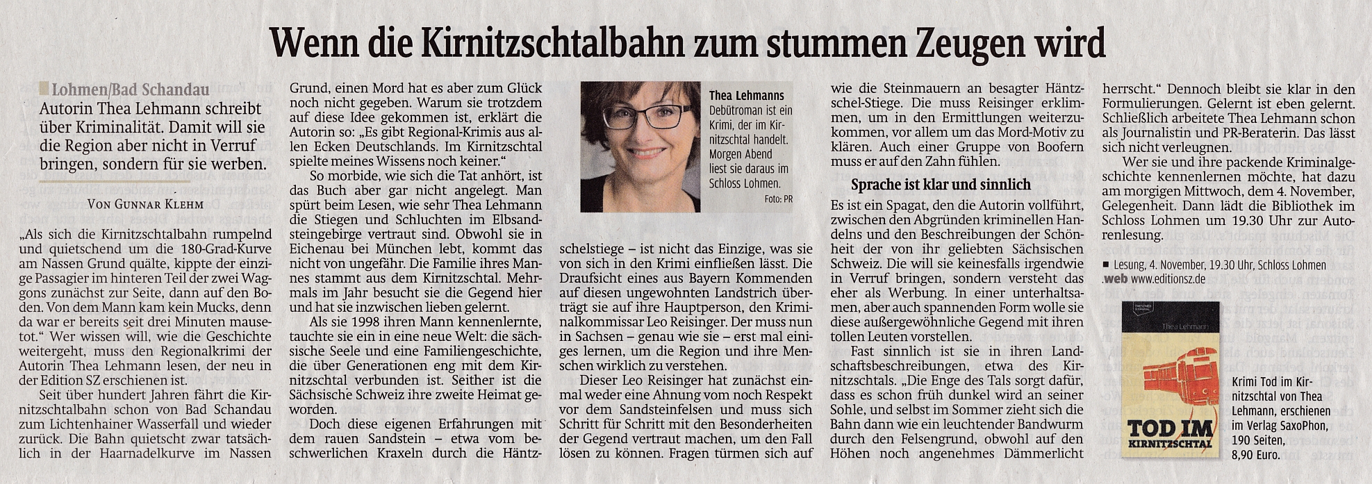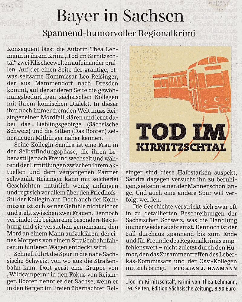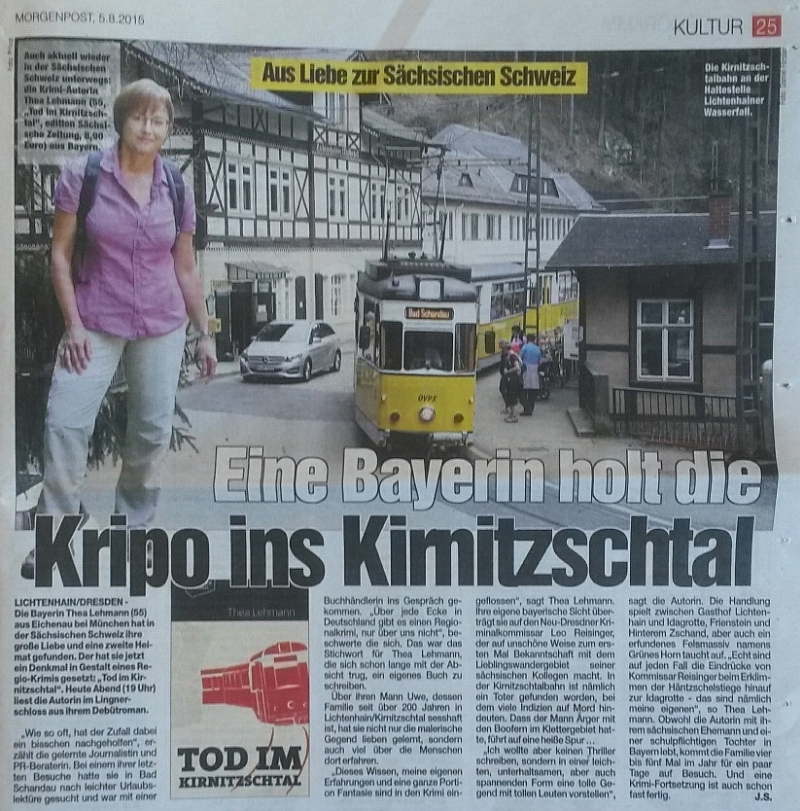Dort oben zum zweiten. Wobei: Weit oben ist dieser Tatort gar nicht, nicht mal 400 Meter über Meer ist die Zyklopenmauer, wo das Unglück passierte, das einen Toten und einen Verletzten forderte. Abstürzen, freiwillig oder nicht, das kann man an den schier unzähligen Felsen des Elbsandsteingebirges in Ostdeutschland allerdings schon. Und wenn dann noch die falsche Ausrüstung, nämlich ein neues Westseil eingesetzt wird, kann Unvorhergesehenes passieren. Aber warum geht dann an der gleichen Stelle in der Nähe der berühmten Sehenswürdigkeit Kuhstall das Leben von Unternehmer Schüppel zu Ende? Thea Lehmann, in Oberbayern aufgewachsen und mit einem Sachsen verheiratet, verfasste bisher fünf Krimis, die in der Sächsischen Schweiz spielen. „Tatort Kuhstall“ ist ein knotenstarker Bergkrimi, am schönsten zu lesen auf dem Malerweg durch die Sächsische Schweiz oder in der Kuhstallbar auf der Mägisalp in der helvetischen. Lehmanns jüngster Band heisst „Tödliches Schweigen im Sandstein“. Fels also auch da.