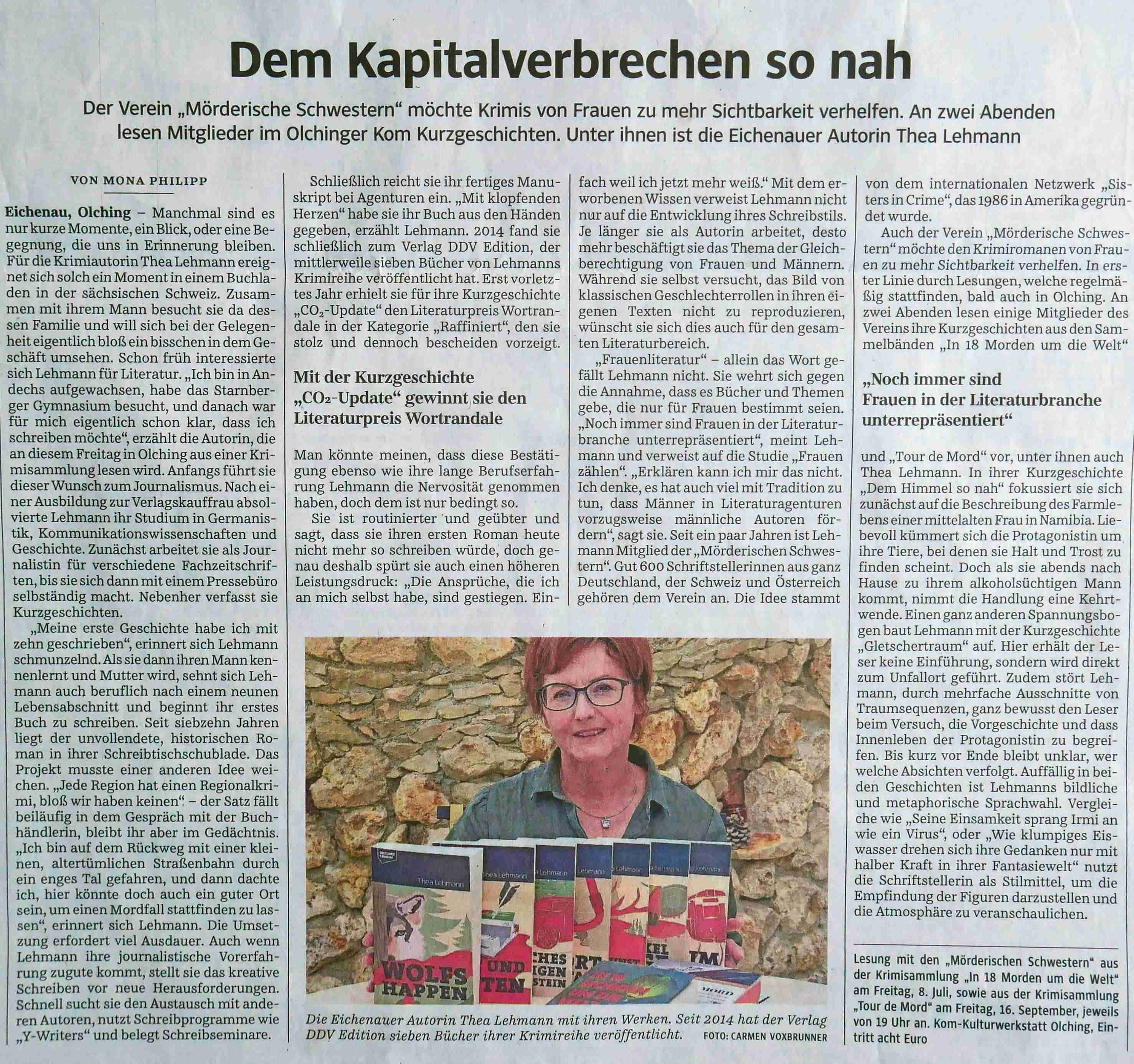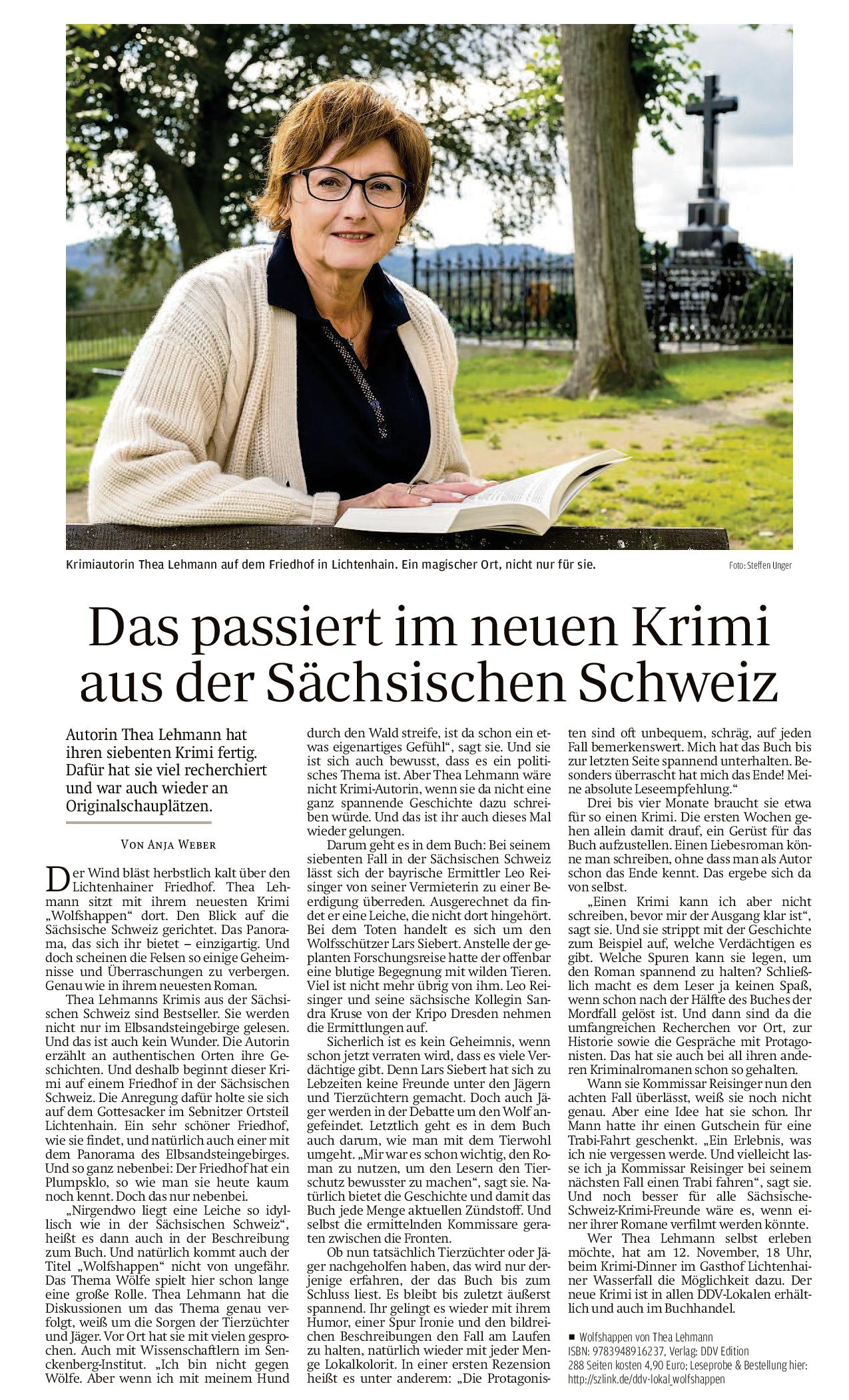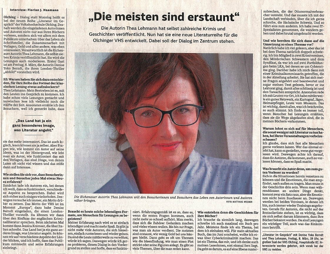Lesung “Wolfshappen” und “Todesklamm” am 10.04.2025https://www.meerane.de/aktuelles-ausgabe/man-kann-mindestens-15-literarische-leichen-im-kirnitzschtal-ablegen-autorin-thea-lehmann-begeistert-mit-lesung-in-der-stadtbibliothek-meerane.html |